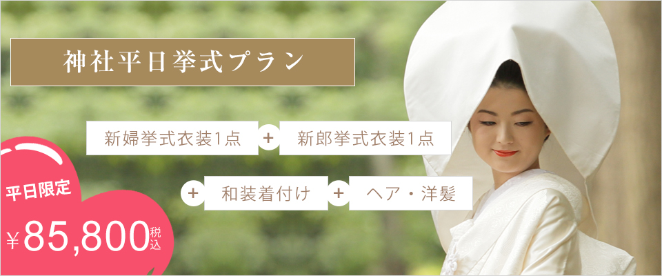 平日に挙式を挙げることで、低価格となっております。衣装は、新婦挙式衣装「白無垢」「色打掛」「黒振」より1点お選び頂き、新郎は紋服となります。、また、着付け代、新婦様の美容(洋髪のみ)もプランに含まれております。